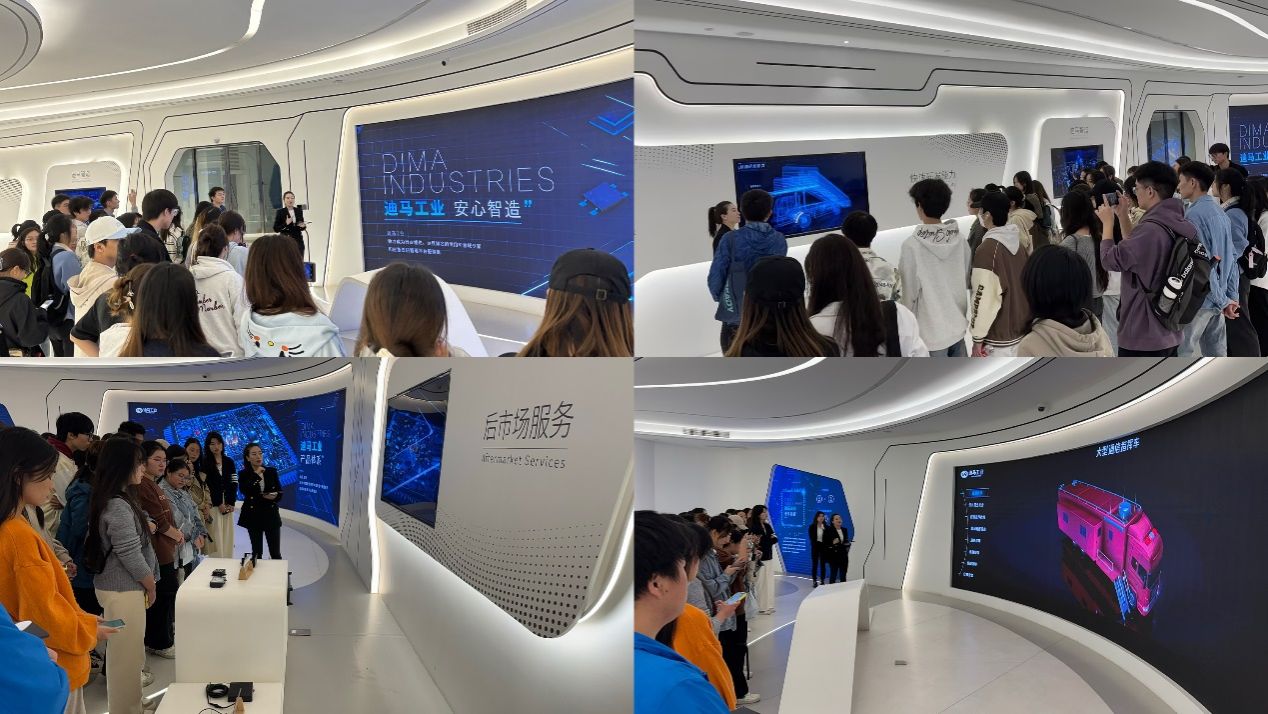 师生们抵达迪马工业后,受到了公司行政部经理罗丹女士以及副经理曾婷婷女士的热情接待。在两位领导的陪同下,师生们首先参观了迪马工业的公司展厅,了解了公司的历史沿革、企业文化以及在特种车辆制造领域的创新成果。迪马工业是国内首家实现批量出口海外市场的专用汽车企业,以及重点高新技术企业。在应急通讯指挥车、防弹运钞车等领域市场占有率遥遥领先,其中防弹运钞车市场占有率超过40%,连续20多年居行业第一。