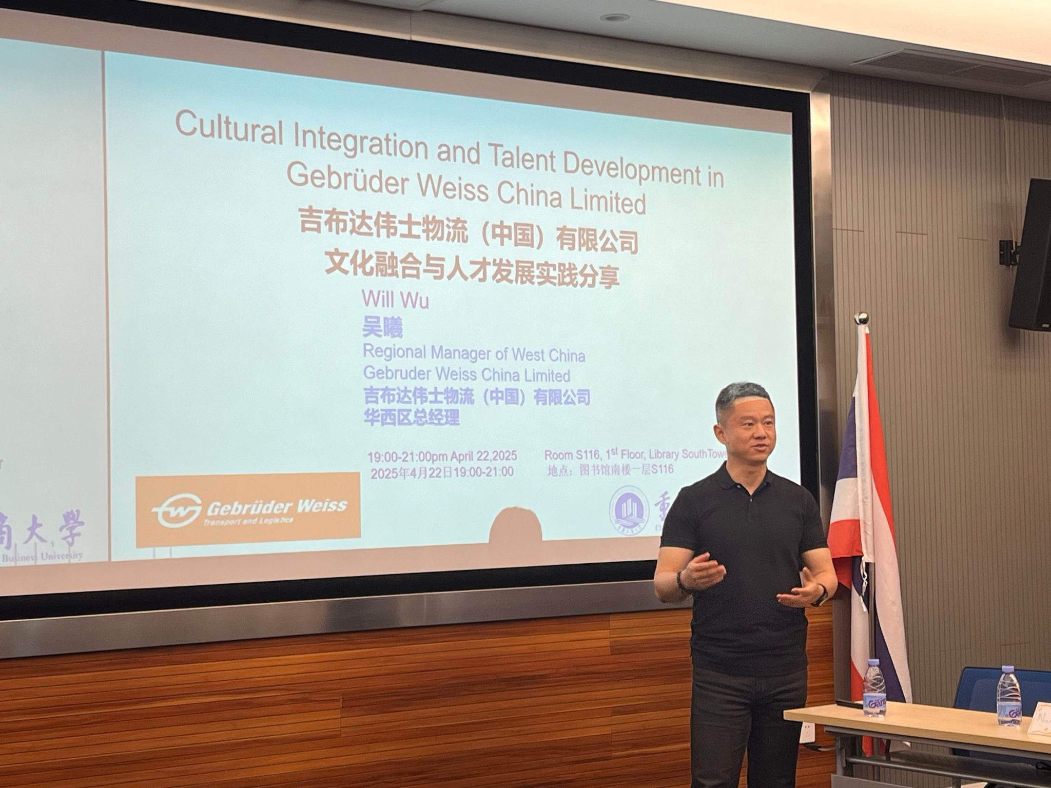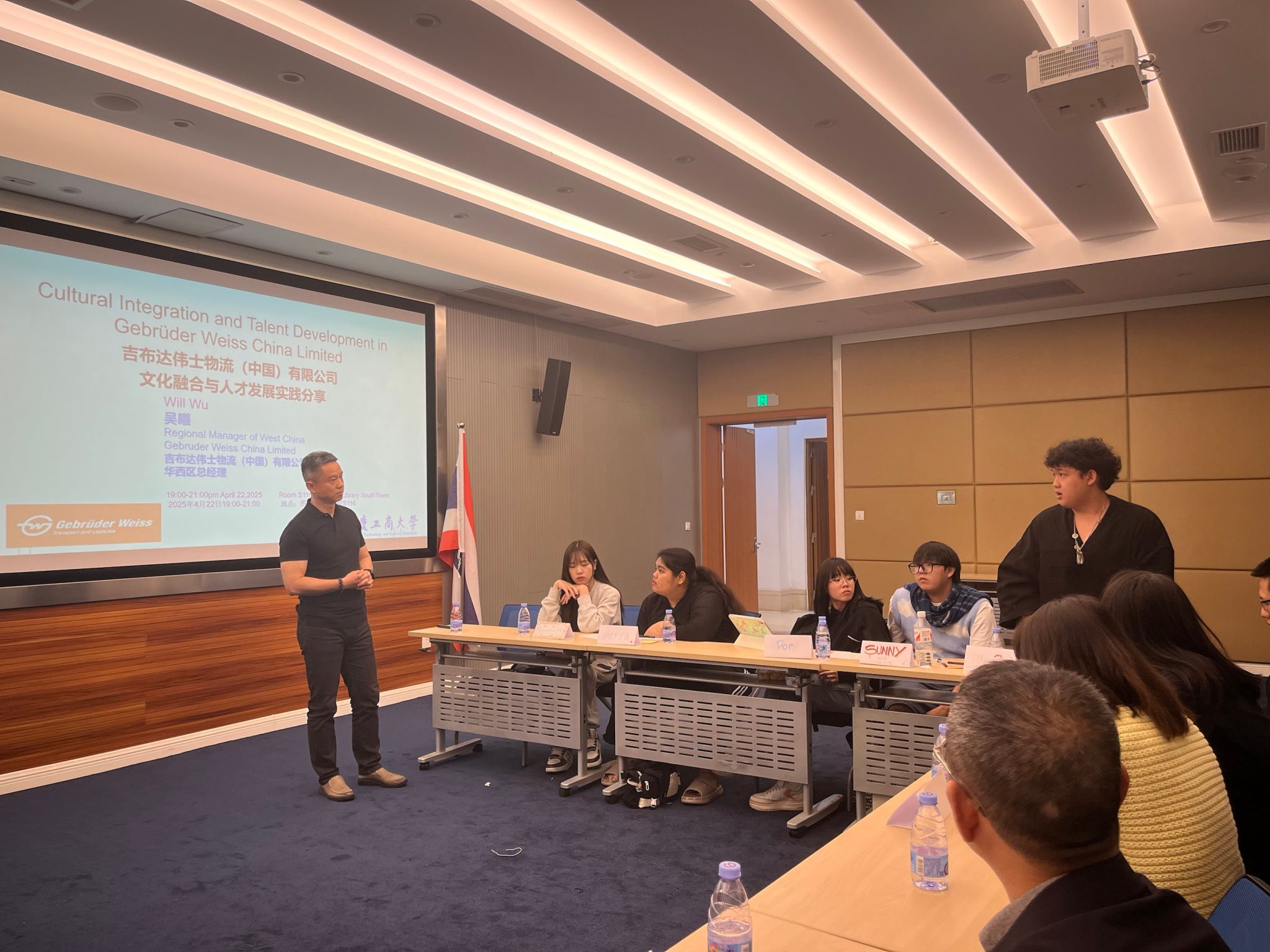 2025年4月22日晚,由2138cn太阳集团古天乐鄢清华老师、杨椅伊老师所在的《跨文化管理》(全英文)、《旅游与酒店业人力资源管理》(全英文)及《国际人力资源管理》课程组主办的“跨国企业实践分享”教学环节在图书馆南楼S116教室成功举办。本次活动以“文化融合与国际人才发展实践”为主题,特邀吉布达伟士物流(中国)有限公司(Gebrüder Weiss China)华西区总经理吴曦先生担任主分享人,活动吸引我校人力资源专业、国际旅游管理专业的本科生、研究生及我校来自泰国、越南、乌克兰等国家的10多名国际学生共同参与。利宝保险副总经理邱娅莉女士、太阳集团2138校友创业联合会执行会长金赵亮先生、重庆思略特咨询合伙人陈凌峰先生、公共管理学院唐礼武老师等嘉宾出席,共同探讨跨国企业的文化融合与人才开发实践,全程大部分用英文交流。
