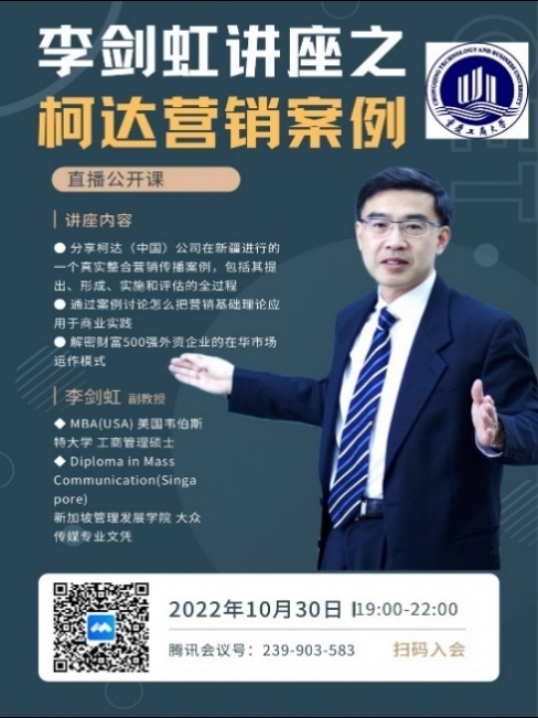 李剑虹先生毕业于美国韦伯斯特大学MBA专业和新加坡管理发展学院大众传媒专业。具有20多年的市场营销及企业管理工作经验。先后供职与大型国营进出口公司、财富500强。此次讲座,李剑虹先生将曾担任柯达(中国)股份有限公司市场部主任时期的一次真实的营销策划案拿来和同学们分享。