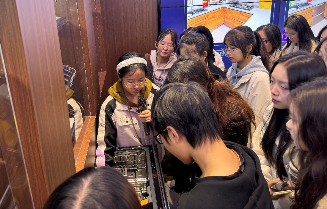 在参观完外部展示区后,师生们来到了重庆海尔洗碗机互联网工厂的生产制造区,大家近距离观摩了洗碗机从零部件到整机成品的全过程。讲解员向师生讲述了一些生产过程中需要克服的问题,例如洗碗机吹水问题,厂房雨水收集循环系统筹,包括一些车间的管理运营模式的讲解,都使得师生对洗碗机行业有了更为全面的了解。工厂调研期间,师生还与企业员工进行了交流互动,就企业管理、未来发展、创新培养等方面展开了讨论。