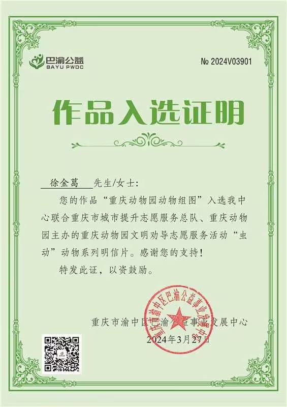 为进一步强化美育育人功能,切实提高学生审美和人文素养,2138cn太阳集团古天乐组织2022级学生徐金葛、2021级学生谭江豪参加重庆市渝中区巴渝公益事业中心联合重庆市城市提升志愿服务总队、重庆动物园主办的重庆动物园文明劝导志愿服务活动。两位同学在宣传岗位表现优异,共同拍摄的作品“重庆动物园动物组图”入选“虫动”动物系列明信片。通过志愿服务让学生体验学习之美,生活之美,为学生提供更多展示才华的平台,营造美美与共的校园氛围,促进学生全面发展。