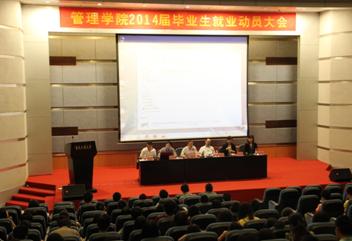 为了更好推动2014届毕业生更好地顺应社会的需求,2013年9月25日下午2:30,管理学院2014届毕业生就业动员大会在博智楼7100学术报告厅召开。管理学院党总支书记王建明、副院长王兰、党总支副书记尹建平、教务办老师吴孔珍、学院学生档案工作负责人聂树平老师以及学院2014届毕业生参加了大会,学团办主任卓志宏老师主持本次会议。
