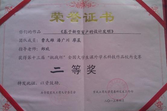 近日,第十三届“挑战杯”全国大学生课外学术科技作品竞赛重庆赛区总决赛现场传来喜讯,管理学院曹久雄、潘广川、廖晨、罗绫等四位同学组成的“新动力”参赛小组的作品《新型旋转推拉窗设计发明》获得重庆赛区二等奖。此次大赛由共青团重庆市委、重庆市教委、重庆市科协、重庆市学联联合主办。