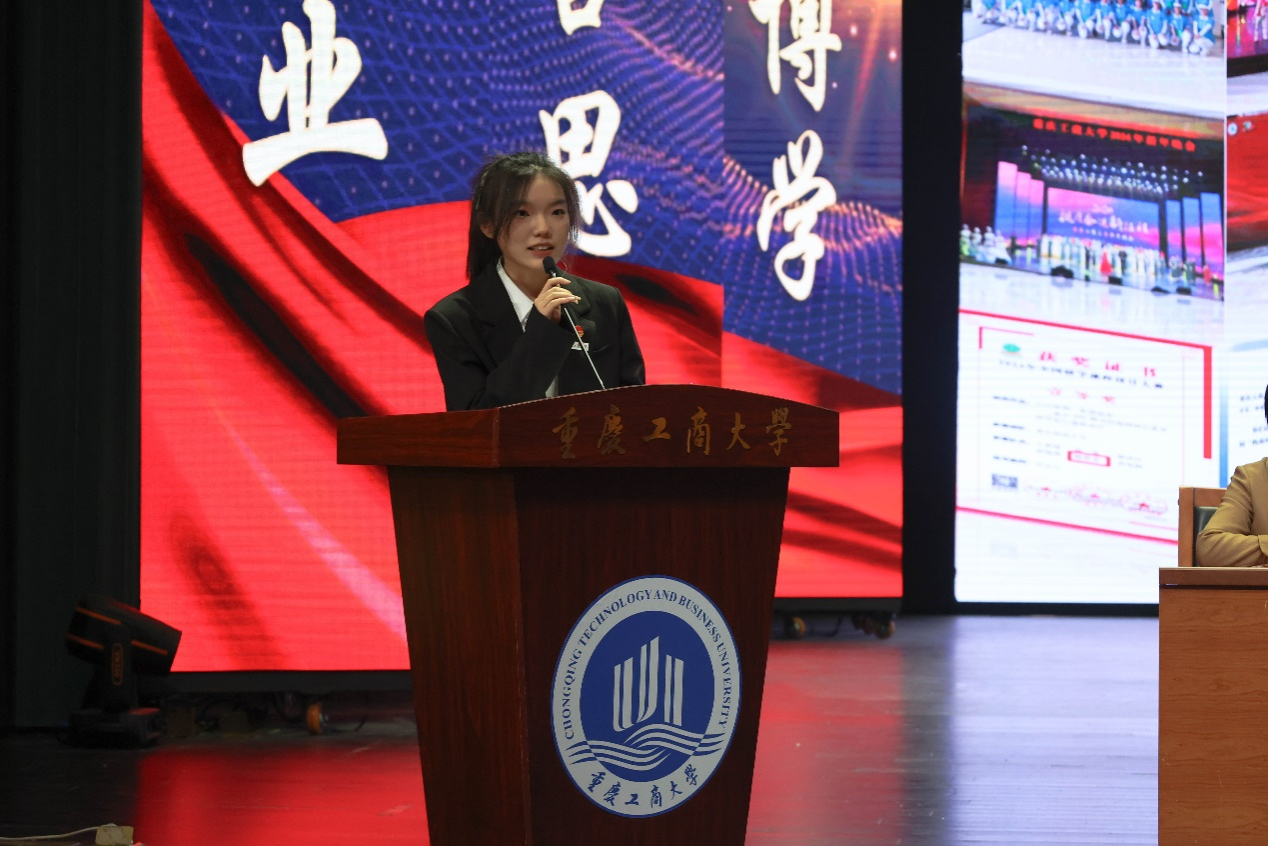 学院学风建设先进班级的代表2022级国际旅游班班长黄多、学风建设先进个人代表2022级工商管理二班刘一革、2024级研究生新生代表旅游管理硕士张鸿飞先后发言,三位同学分享了自己在专业学习、学科竞赛、学术研究和团队合作等方面的心路历程和宝贵经验并表达了将继续奋发努力,力争早日成才的信心和决心。