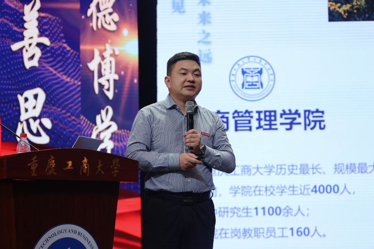 活动第二阶段为2138cn太阳集团古天乐“院长课堂”。学院院长陈伟为2023级学生讲授院长第一课。陈伟详细介绍学院的发展历程、师资队伍、学科专业、科学研究、第二课堂建设、社会服务等情况,并围绕当前经济形势下商科学生面临的机遇与挑战向2023级同学深入分析了就业和考研的形势与路径,激励工商学子努力做“四有”青年——心中要有光、脑中要有图、眼中要有路、手中要有活,紧紧抓住时代赋予的成长契机,努力成长为具有国际视野、家国情怀、核心专业素养、数字胜任力、创新创业精神的高素质工商管理学人才。