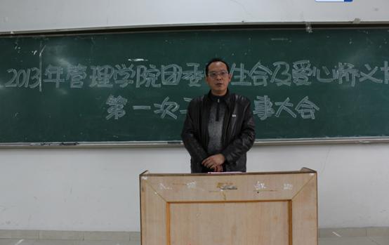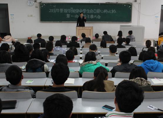南山脚下,紫气东来,春意正盛。2013年3月1日,2012-2013学年第二学期管理学院团委学生会及爱心桥义协第一次干部及干事大会在我校博智楼7421教室成功举行。学院党总支王建明书记、王兰副院长、党总支尹建平副书记等学院领导亲临本次大会进行指导。参加会议的除了管理学院团委学生会干部及干事,爱心桥义协干部、干事,各班班长和团支书外,还有管理学院分团委书记卓志宏老师以及管理学院北二、北五楼栋党员服务站指导老师聂树平老师等。会议由分团委书记卓志宏老师主持。