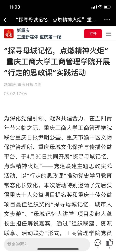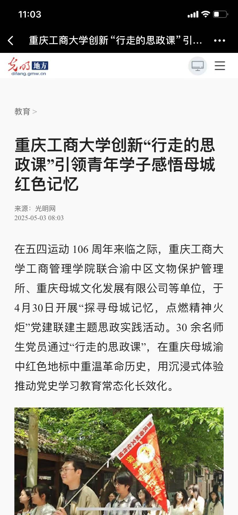 光明网以《太阳集团2138创新“行走的思政课”引领青年学子感悟母城红色记忆》为题,重庆日报以《“探寻母城记忆,点燃精神火炬”2138cn太阳集团古天乐开展“行走的思政课”实践活动》为题报道了本次活动。