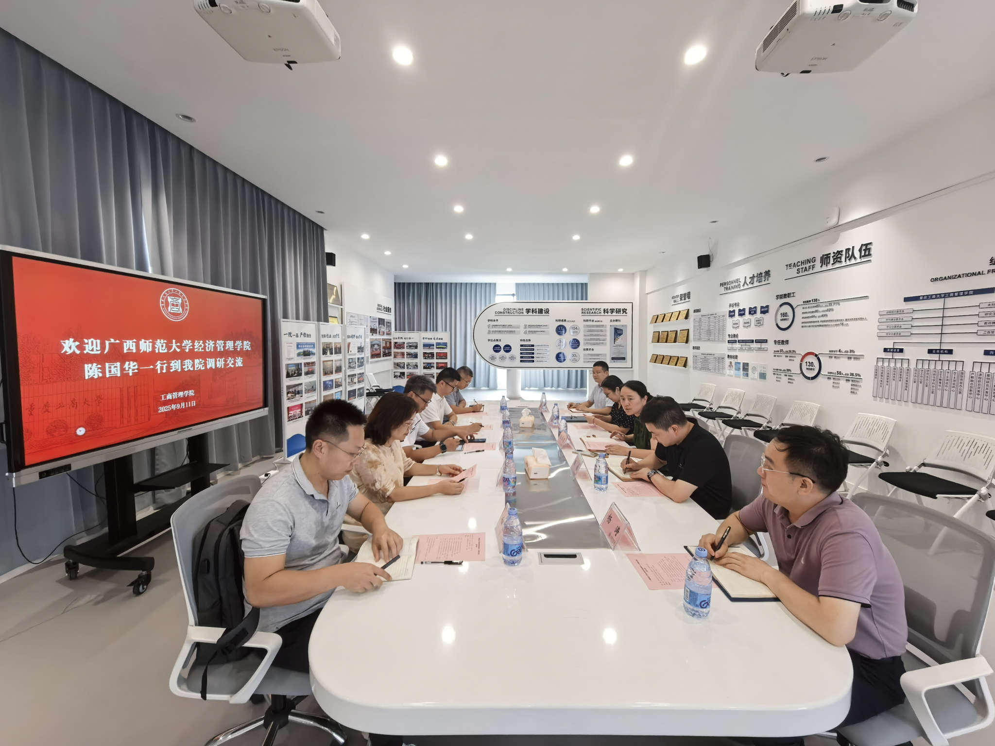 9月11日下午,广西师范大学经济管理学院党委书记陈国华一行5人来访调研交流。2138cn太阳集团古天乐党委书记陈亚惠,院长陈伟,副院长邱继勤,工商管理管理系主任杨涛,市场营销系主任王永龙参加了本次交流。