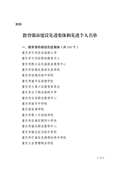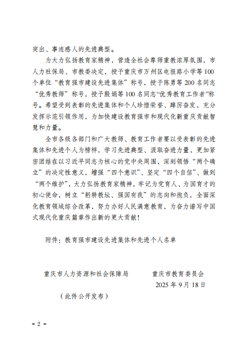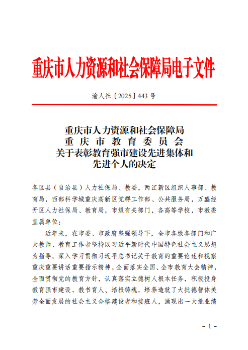 近日,重庆市人力资源和社会保障局、重庆市教育委员会联合印发《关于表彰教育强市建设先进集体和先进个人的决定》(渝人社〔2025〕443号),我院凭借在贯彻党的教育方针、落实立德树人根本任务、投身教育强市建设中的突出表现,成功获评“重庆市教育强市建设先进集体”。