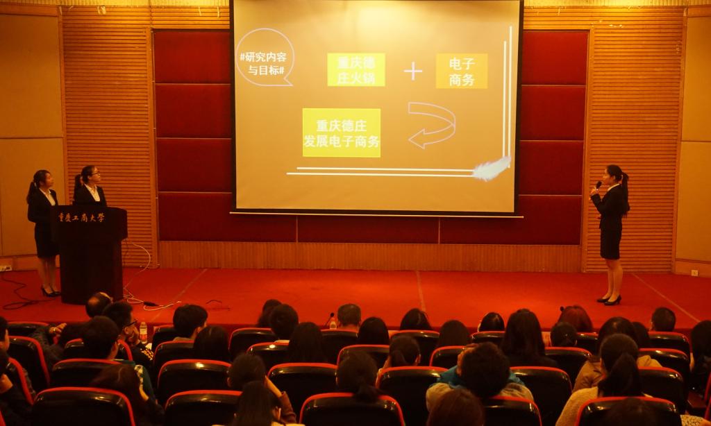 1+1团队将重庆餐饮电商化作为研究对象,通过对餐饮电商化的综合分析指出了餐饮电商化面临的诸多问题,并提出了自己的见解,评委老师根据她们的表现给了她们相应的建议。