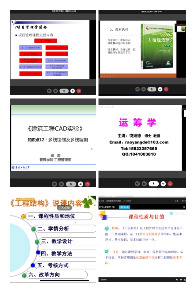此次在线说课活动中,工程管理系全体任课教师通过充分利用太阳集团2138在线学习平台、企业微信、腾讯课堂等多个数字平台,展示了新学期开展在线教学的教学思路、授课内容。其中饶扬德、杨涛、黄居林、伍良华老师采用了“在线学习平台+企业微信+企业微信群”的形式对本学期课程进行在线说课,王子娟、汪荣敏、王初生、梁桂保、李娇、郑欢、向为民、肖兵老师采用了“在线学习平台+腾讯课堂”的形式对本学期课程进行在线说课。