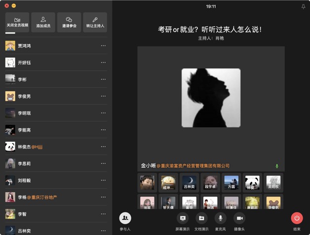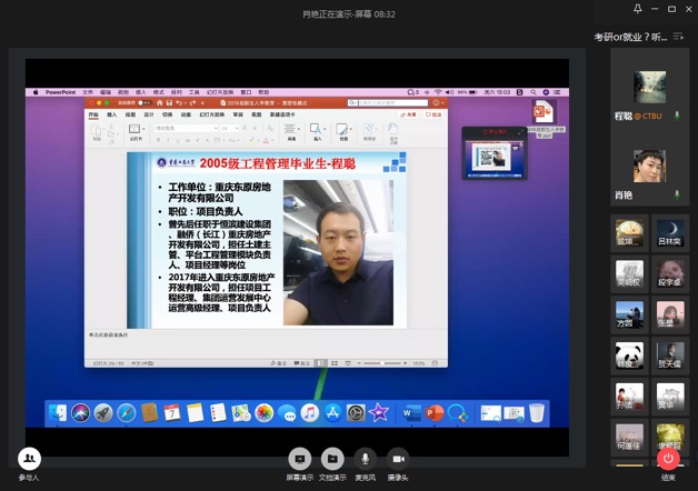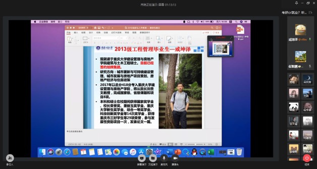 2020年3月7日下午15:00,管理学院工程管理专业召开题为“考研or就业?”的在线网络讨论会议。本次会议由工程管理系主任肖艳老师主持,17级工程管理专业全体同学以及部分18级学生代表参加了本次会议,会议还邀请到程聪、林俊杰、谷威洋、金小晰、咸坤泽、张增全、文强、李杨、任智勇、陶步天共10位校友导师参会。