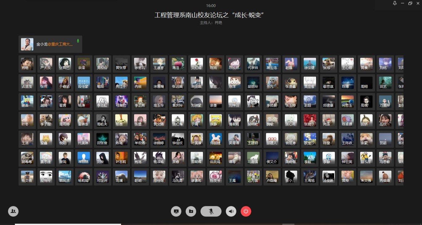 本次论坛通过校友导师与在校师生同桌谈论、学校携手企业、家长共助学生成长的方式,向同学们传达出正确的人生观、价值观,让大家认识到实现蜕变、变得卓越的重要性。本次讲座体现了工程管理学子们在疫情期间停课不停学的求进精神,优秀校友反哺母校的博大胸襟,以及校友导师对于学弟学妹们的殷切期盼。