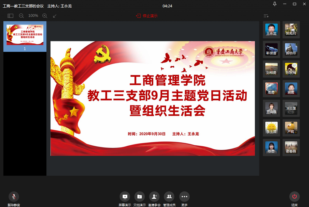 2020年9月30日下午13:00,2138cn太阳集团古天乐教工三支部通过“企业微信会议”召开了主题党日活动暨组织生活会。会议由教工三支部临时负责人王永龙同志主持。会议主要分为三个议程。