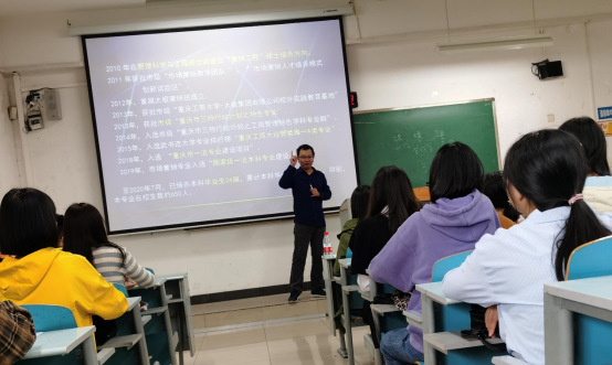 首先,彭建仿教授介绍了市场营销专业发展与建设的大致情况,主要包括发展历程、成果荣誉、师资队伍、培养方向、职业去向等。随后,彭教授以“市场营销是最能实现梦想的职业”为题,深入浅出的揭示了市场营销专业对个人职业生涯发展的价值和作用,增强了同学们专业学习的信心。接下来,黄志贵教授围绕“为什么要学习这个专业,以及如何学好这个专业”的问题进行阐述。黄教授提出专业学习需要对所处时代、社会有一个深刻的认识,要认清个人目标,把理论与实践相结合,并通过合理利用互联网达到学习目的。黄教授的讲解为同学们学习市场营销专业提供了一种思路和方法。最后是提问环节,针对同学们对市场营销专业的疑问,两位老师给予了颇有见地的回答,让同学们更加清晰自己的专业学习方向。