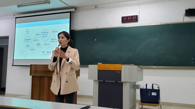 宣讲会上,旅游管理系主任白佳飞老师回顾了“希尔顿班”自2013年开班以来的发展历程,指出希尔顿班的设立为同学创造了学以致用的平台,是本院校企合作、校企融合的突出典范。同时,白老师指出实践是旅游管理专业、酒店管理专业教学中的重要环节,也是学生踏入社会前的必要锻炼。白老师还感谢了希尔顿国际长期在校企合作中做出的努力。