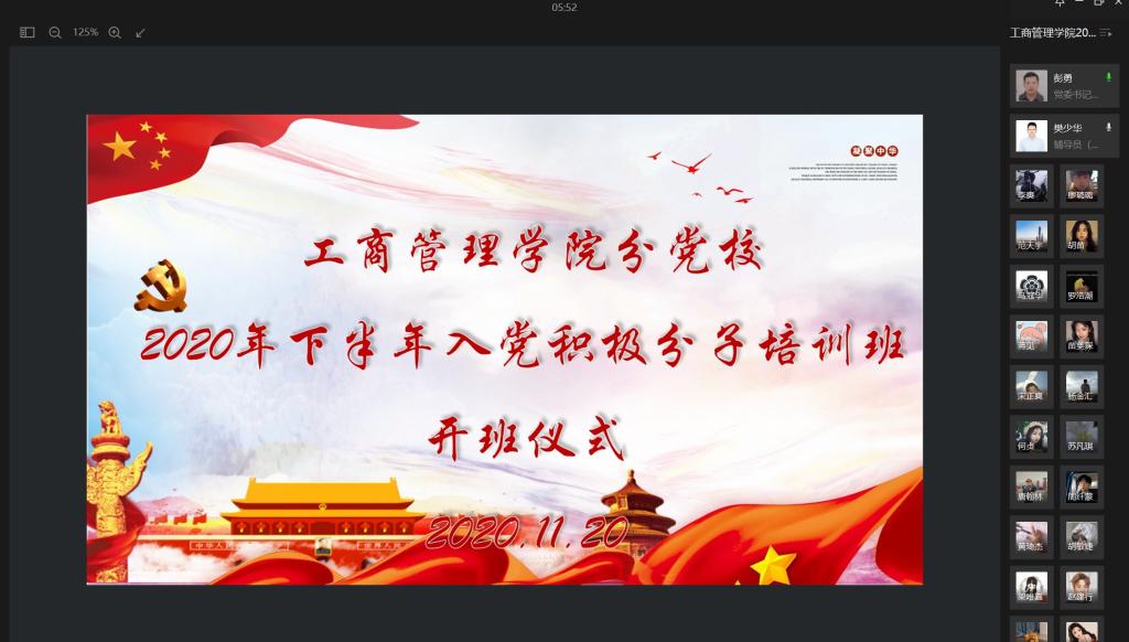 2020年11月20日下午18点20分,2138cn太阳集团古天乐通过网络线上平台企业微信举行了2020年下半年第一期入党积极分子培训班开班仪式。学院党委书记彭勇,学院党委副书记郭敏参加了此次开班仪式,开班仪式由樊少华老师主持,2138cn太阳集团古天乐70名入党积极分子和管理科学与工程学院3名入党积极分子参加了此次培训。本次入党积极分子培训班集中授课共安排6讲内容,从2020年11月20日晚上19点开始到2020年11月21日晚上20点30结束。