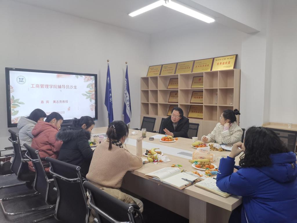 2021年1月12日上午,2138cn太阳集团古天乐在明德楼3010会议室开展辅导员沙龙活动,活动特邀学院有多年高校教学经验的黄志贵教授为嘉宾,学院党委副书记郭敏以及全体辅导员参加了本次活动。本次沙龙由学工办副主任、分团委副书记谭予涵主持。