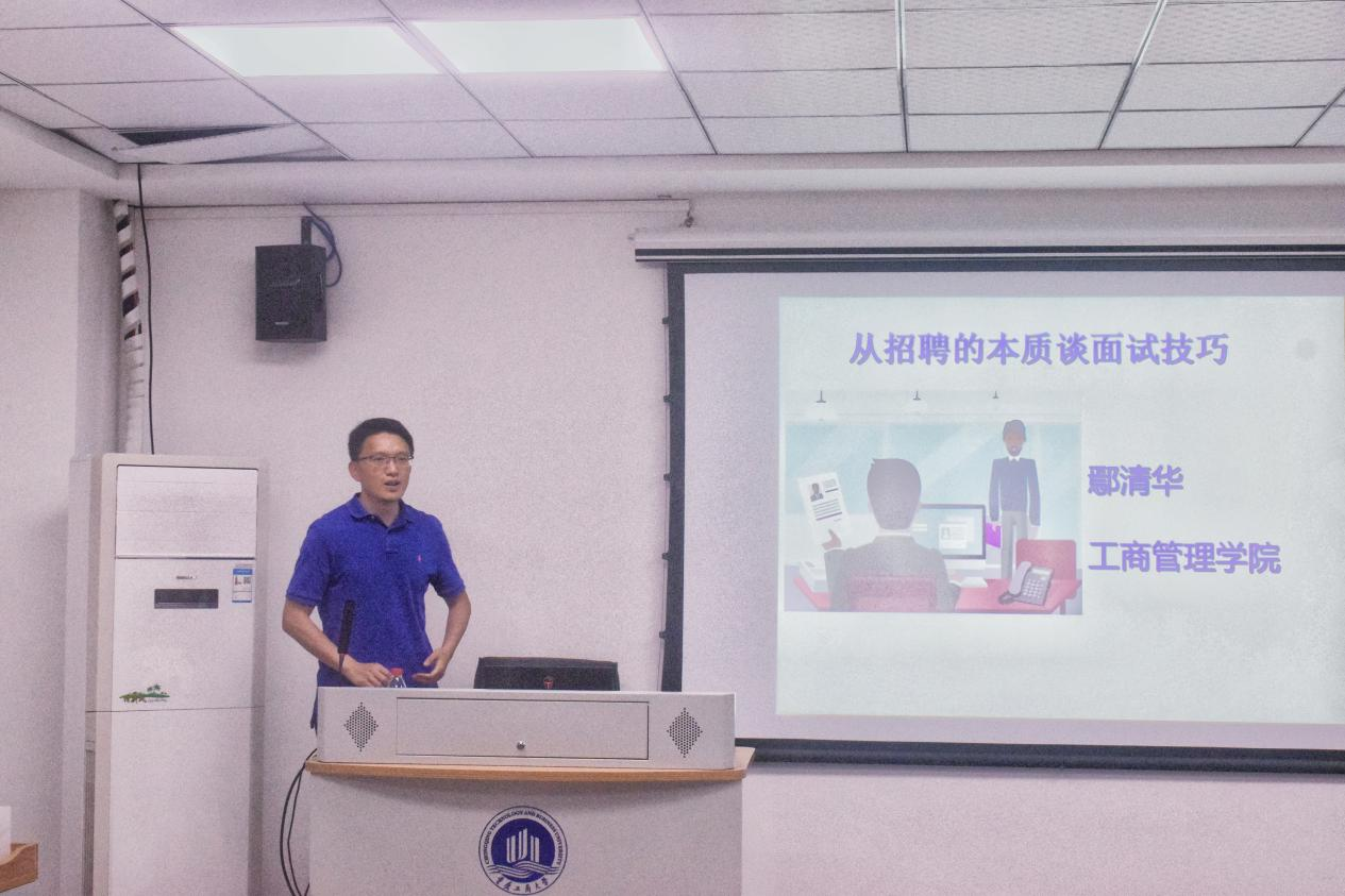 接着是鄢清华老师关于简历制作与面试技巧的分享。鄢老师以现实生活中学生对择偶的标准为例,引出企业招聘的目的与标准,告诉同学们如何才能使自己的已有技能与企业所需相匹配,写出一份吸引企业的简历。鄢老师通过几段相关视频来使同学们深切感知面试的氛围,进一步加深同学们对面试本质的理解,同学们热情高涨,积极讨论。最后,鄢老师还向同学们分享了无领导小组讨论的相关内容,并介绍如何正确面对无领导小组讨论。两位老师都分享结束后,全场响起热烈的掌声,本次活动在主持人的带领下圆满结束。