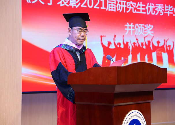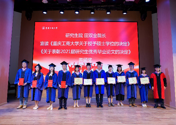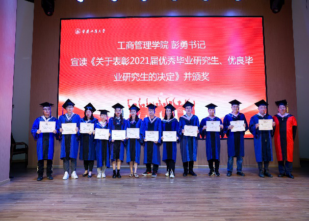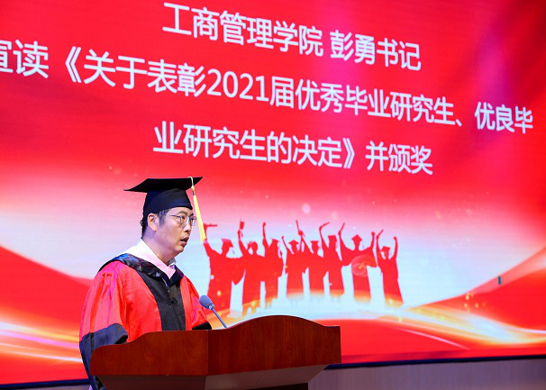 之后,开始了本次毕业典礼的第二项议程“优秀MBA研究生表彰仪式”。研究生院田双全院长宣读了《关于授予128名毕业生硕士学位的决定》、《关于表彰2021届研究生优秀毕业论文的决定》,并为胡志建等11位优秀毕业论文作者颁发了荣誉证书。随后,工商管理学员彭勇书记宣读了《关于表彰2021届优秀毕业研究生、优良毕业研究生的决定》,并为吴海波等10名毕业生颁发了“优秀毕业生”荣誉证书,为汤海波等12名毕业生颁发了“优良毕业生”荣誉证书。他们的优秀充分展现了MBA学生的精神风貌,充分体现我校MBA教学质量在不断提升。