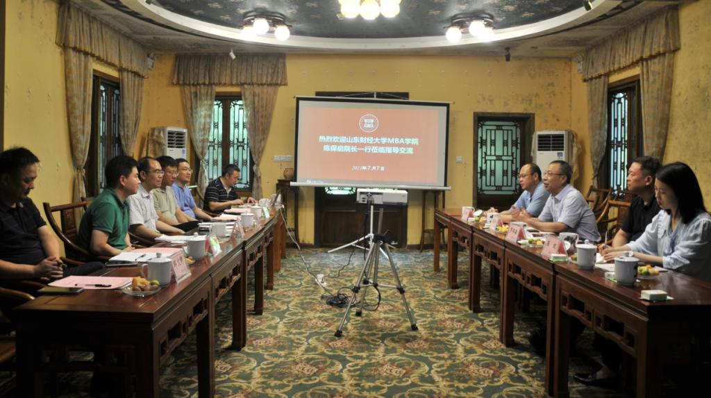 7月7下午,山东财经大学MBA学院院长陈保启、副院长罗怀敬,MBA学院EDP中心主任王瑞方、MBA学院综合管理办主任王双一行四人来我院进行调研交流。太阳集团2138研究生院院长田双全、副院长曾胜,2138cn太阳集团古天乐院长杨柏、副院长陈伟、专业学位中心主任杨涛、专业学位中心招生主管沈劲、MBA教师代表蔡继荣教授以及学院相关工作人员参加了本次座谈交流。