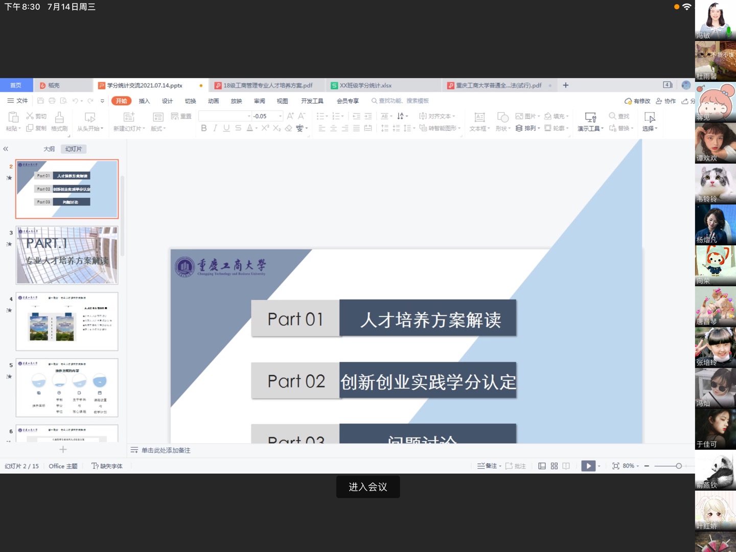 交流会上冯敏老师首先对《本科生专业人才培养方案》进行了解读,简要说明了培养方案的四个板块内容,重点讲解了专业课程设置与教学计划,帮助学生熟悉了课程学习计划;然后指导学生根据人才培养方案进行学分清理,梳理不及格课程累积学分和学籍警示的关系,就挂科学生面临的普遍问题进行了分析和指导;其次冯敏老师根据《太阳集团2138普通全日制本科学生创新创业实践学分认定及管理办法(试行)》、《太阳集团2138创新创业实践学分认定及管理办法补充规定》两份文件内容就双创学分的获得方式和学分置换要求进行了讲解;最后,冯敏老师与学生进行了线上沟通交流,解答了关于学业、学分的各项问题。