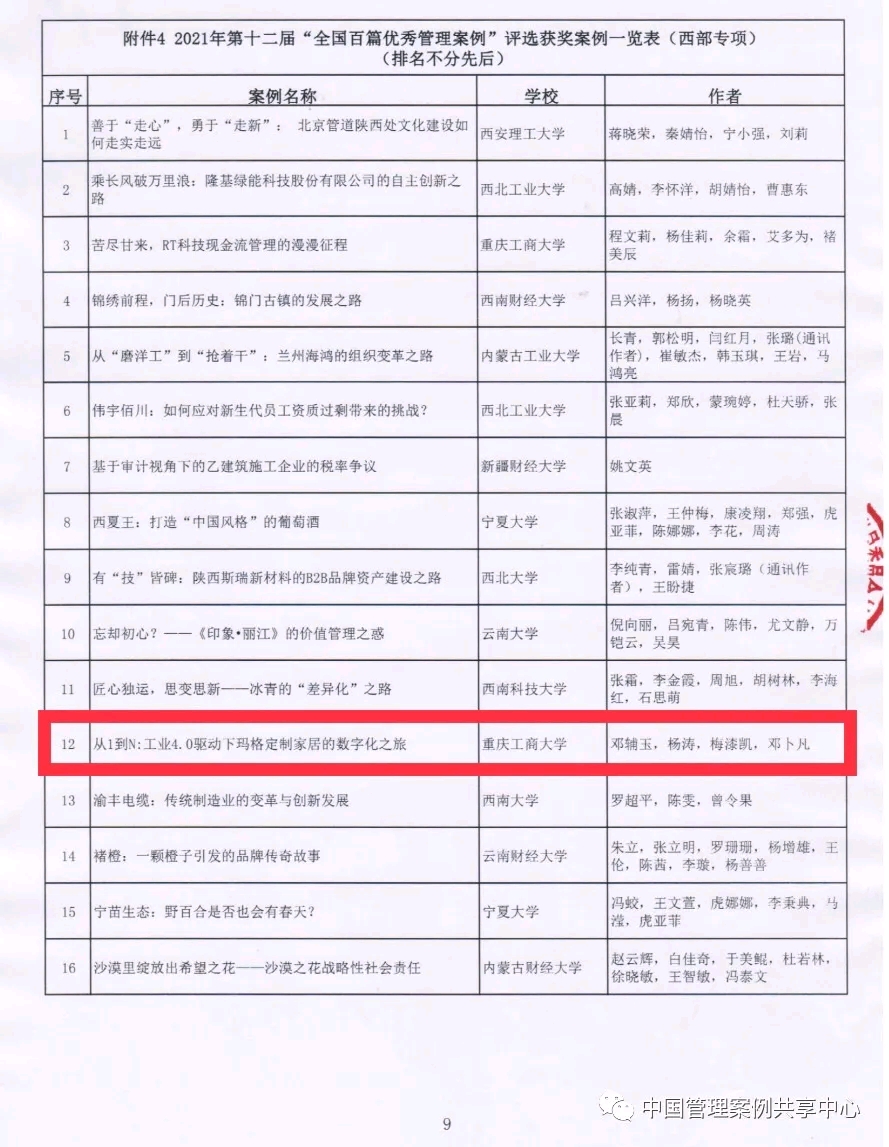 2138cn太阳集团古天乐邓辅玉老师、MBA教育中心杨涛老师合作研究的《从1到N:工业4.0驱动下玛格定制家居的数字化之旅》案例成果,经过层层审评荣获“全国百篇优秀管理案例”(西部专项)。