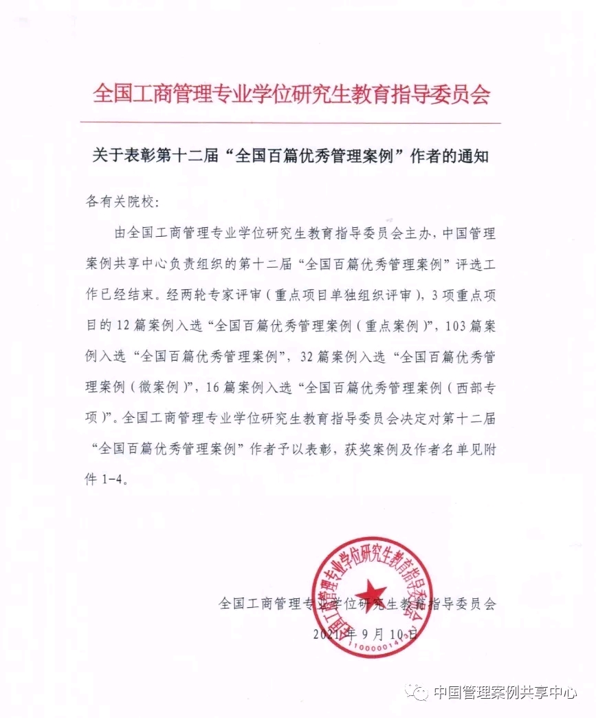 百优案例是全国工商管理案例领域的最高奖项,已纳入2016年工商管理硕士专业学位水平评估指标体系(C1指标),迄今已成功举办十二届。本届评选于2021年3月24日启动,共收到来自全国147所院校的1088项投稿,其中重点项目15项,一般项目734项,微案例专项230项,西部专项109项。 专家评审会按照公开、公平、公正的原则,经过认真讨论,依据案例撰写标准,严格把关,以投票表决的方式,最终确定3所院校的3个立项12篇案例入选“全国百篇优秀管理案例(重点案例)”,64所院校的103篇案例入选“全国百篇优秀管理案例”,23所院校的32篇案例入选“全国百篇优秀管理案例(微案例)”,14所院校的16篇案例入选“全国百篇优秀管理案例(西部专项)”。会议邀请按照公开、公平、公正的原则,专家评审会组织专家评委们认真讨论,依据案例撰写标准,严格把关,以投票表决的方式,最终确定评审结果。最终确定3所院校的3个立项12篇案例入选“全国百篇优秀管理案例(重点案例)”,64所院校的103篇案例入选“全国百篇优秀管理案例”,23所院校的32篇案例入选“全国百篇优秀管理案例(微案例)”,14所院校的16篇案例入选“全国百篇优秀管理案例(西部专项)”。