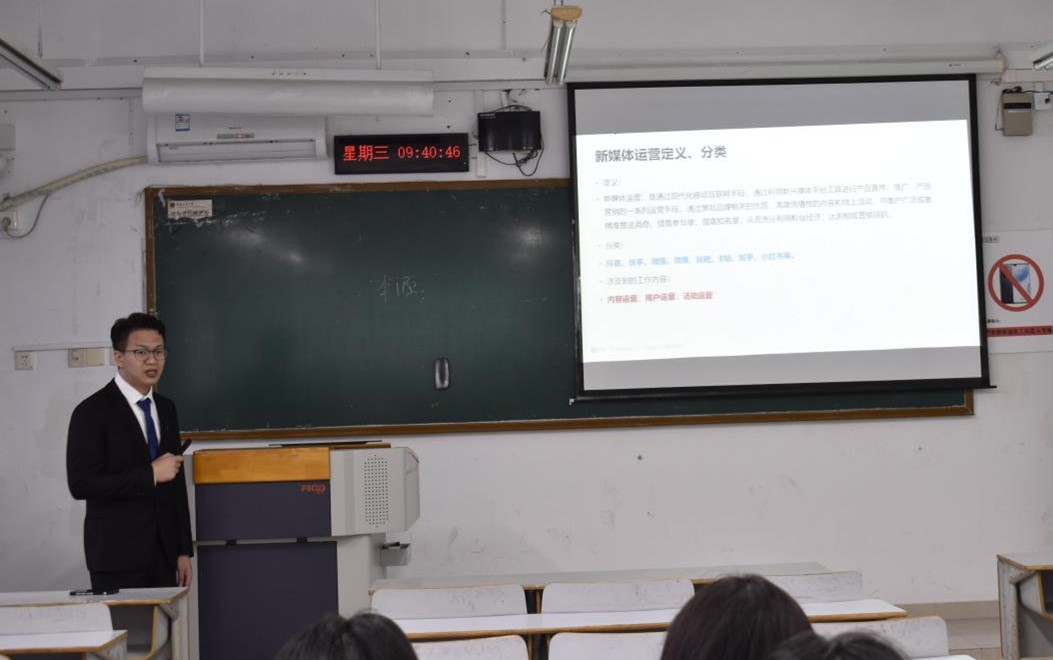 10月14日11:00,慧智楼90424教室,中顺洁柔纸业股份有限公司重庆省办副总经理庞文涛与大四市场营销专业同学做主题为“迈进快消”的课堂交流。庞文涛副总经理就“什么是销售”“销售方案”“销售渠道”三个方向与同学们作了个人经验分享,最后告诉同学们:“想,都是问题;做,才是答案。站着不动,永远是观众”。