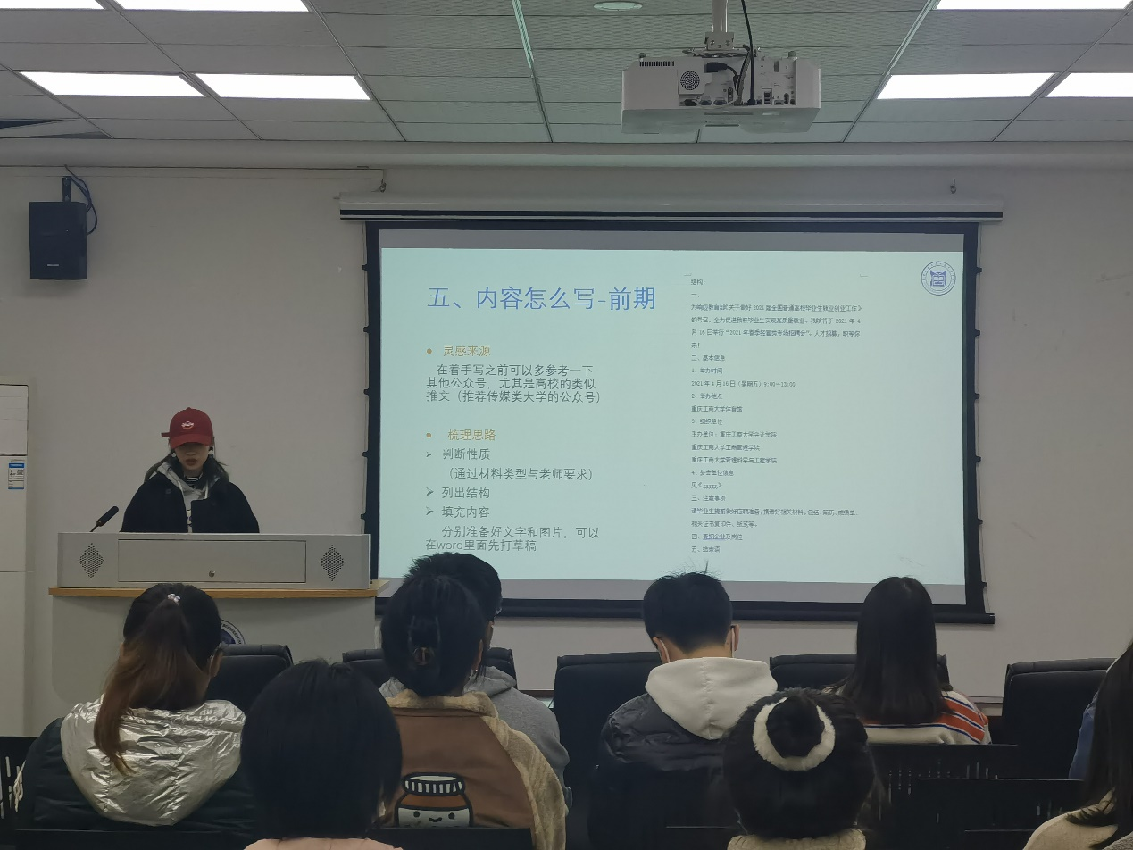 首先由中心执行副主任、19市场营销四班丁莉同学进行推文制作技能培训,结合前几次发布的公众号推文,她从公众号推文的界面区制作、内容构思、公众号推文图文编辑等方面对如何制作高质量的推文进行了分享,并且在分享的最后还同与会同学交流了关于推文制作的小技巧。