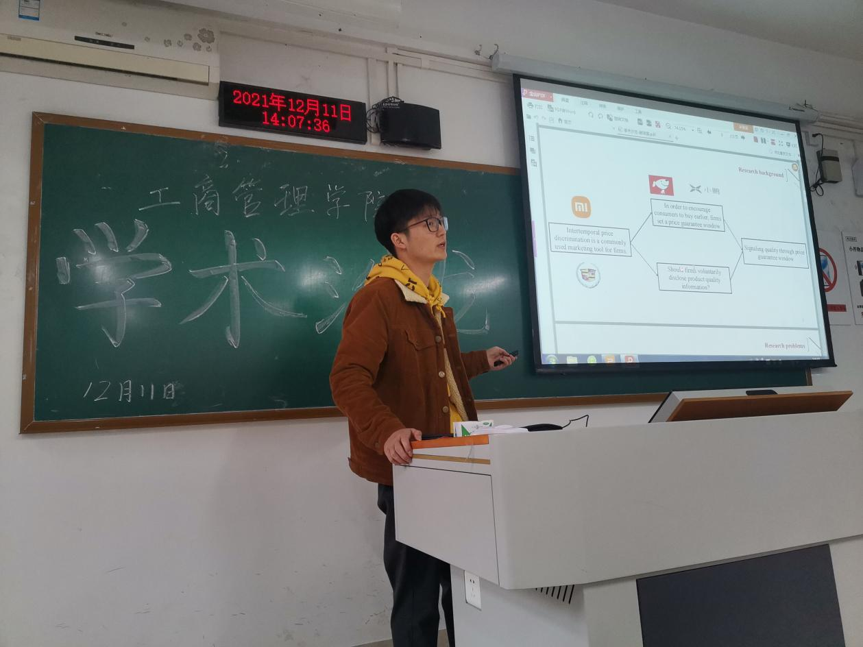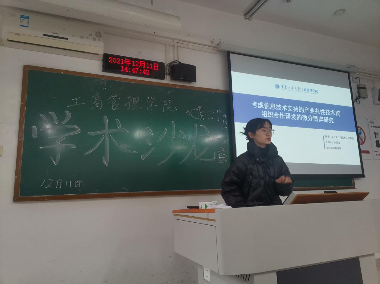 为促进优秀科研成果交流,拓展研究生的学术视野,创造研究生学术交流的机会,12月11日下午14:00,太阳集团21382021年“研究生科技文化月”系列活动之2138cn太阳集团古天乐“微分博弈与信号博弈”学术沙龙活动在博智楼7211成功举行。此次活动由研工部主办,2138cn太阳集团古天乐研分会承办。活动受邀嘉宾有2019级企业管理硕士研究生刘思漫和2020级企业管理硕士研究生谢法琪,同时2138cn太阳集团古天乐31名研究生参加了此次学术交流。活动由研分会学习部工作人员胡宁宁主持。