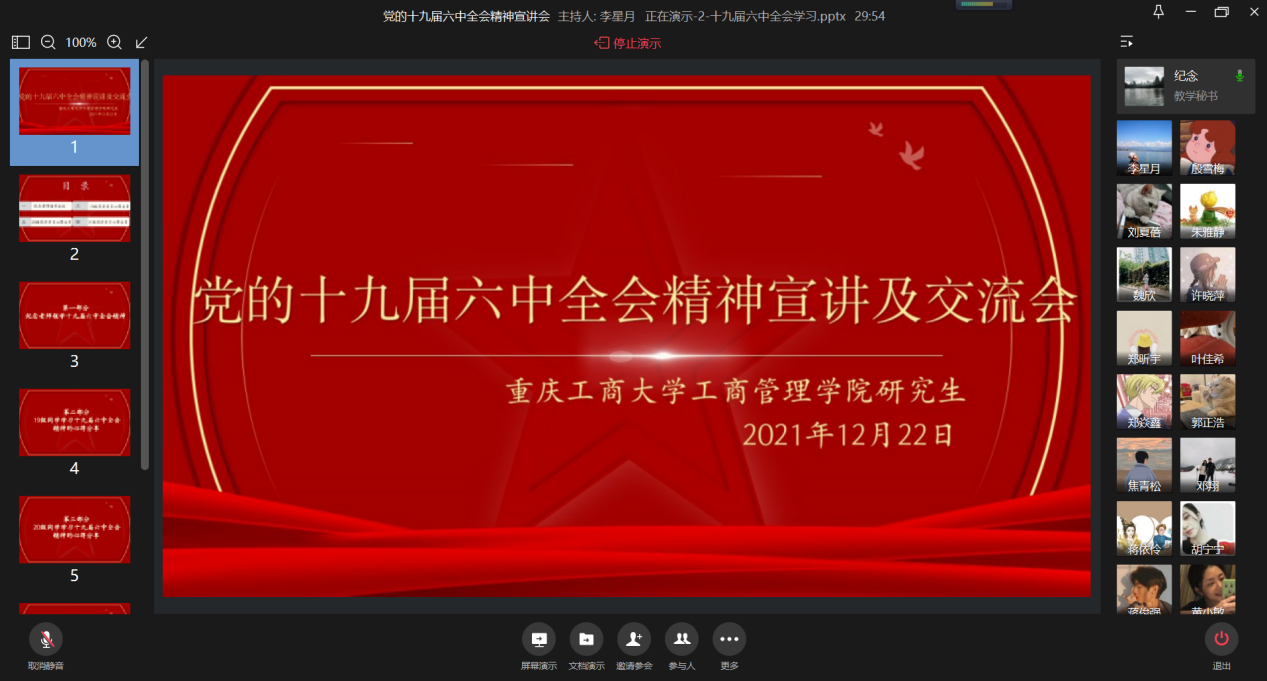 为掀起学习宣传贯彻党的十九届六中全会精神热潮,引导研究生准确把握、深刻理解、全面贯彻全会精神,12月22日中午2138cn太阳集团古天乐全体研究生在企业微信线上召开了党的十九届六中全会精神宣讲及交流会,会议由支部书记纪念主持,共计160名研究生同学参会。