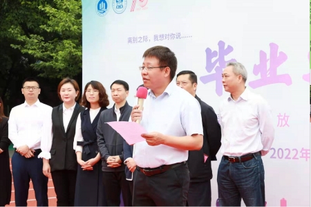 教师代表付青叶发言,他嘱咐同学们,转瞬间,诸君已然登堂入室,步入社会之洪流,必将肩负国家之责任;然,世界局势风云变幻,科技革命日新月异,中华崛起危机并存。汝辈少年,家国之未来,切记:强身健体,博学笃行,知行合一。激励莘莘学子要专注当下,矢志不移,潜心成为平凡中的伟大者;自尊、自立,自爱、自强,努力成就自由之精神、自主之工作和自在之生活!