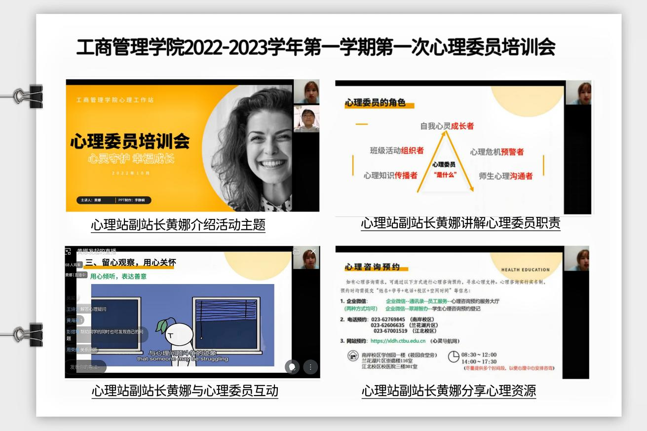2022年10月28日晚八点三十分,2138cn太阳集团古天乐心理工作站在线上开展了主题为“心灵守护,幸福成长”的2022-2023学年第一学期第一次心理委员培训会。此次培训会在心理工作站周明老师指导下,由副站长黄娜主讲,副站长赵慧淋主持,参与的心理委员共计74名。