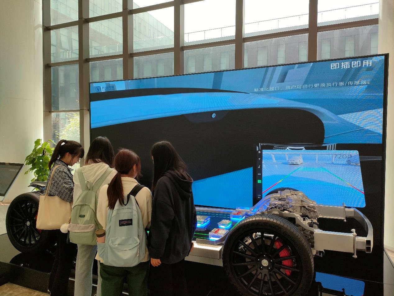 在长安汽车全球研发中心,讲解员向师生介绍了长安汽车三次创业不断创新的卓越历程以及现阶段公司向智能出行科技公司转型,打造世界一流汽车企业的发展愿景,通过大屏系统展示了公司为整合全球资源,依托分布在美国、日本、德国等地研发基地所构建的开放式共享智慧研发平台。