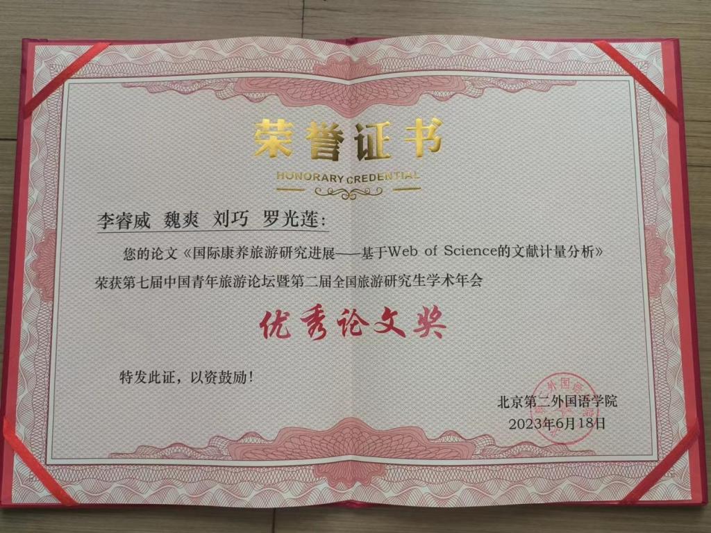 2023617-18日,第七届中国青年旅游论坛暨第二届全国旅游研究生学术年会在北京第二外国语学院举行由罗光莲教授指导,我院21级旅游管理研究生李睿威、魏爽,22级旅游管理研究生刘巧合作撰写《国际康养旅游研究进展——基于Web of Science的文献计量分析》获“优秀论文奖”。