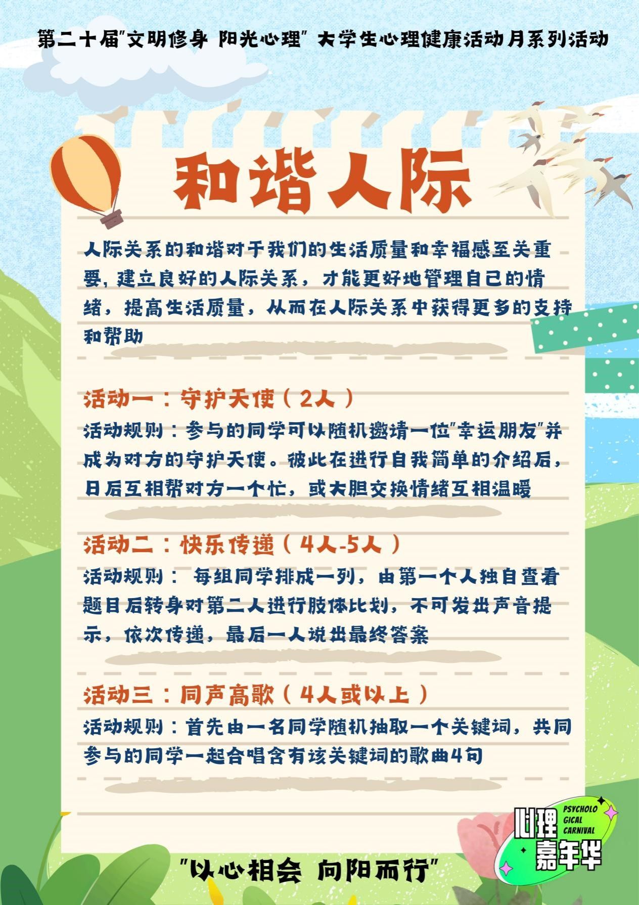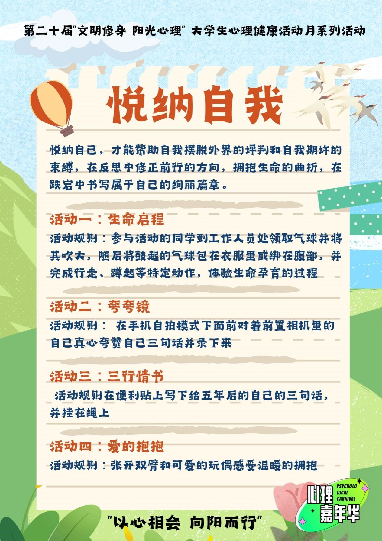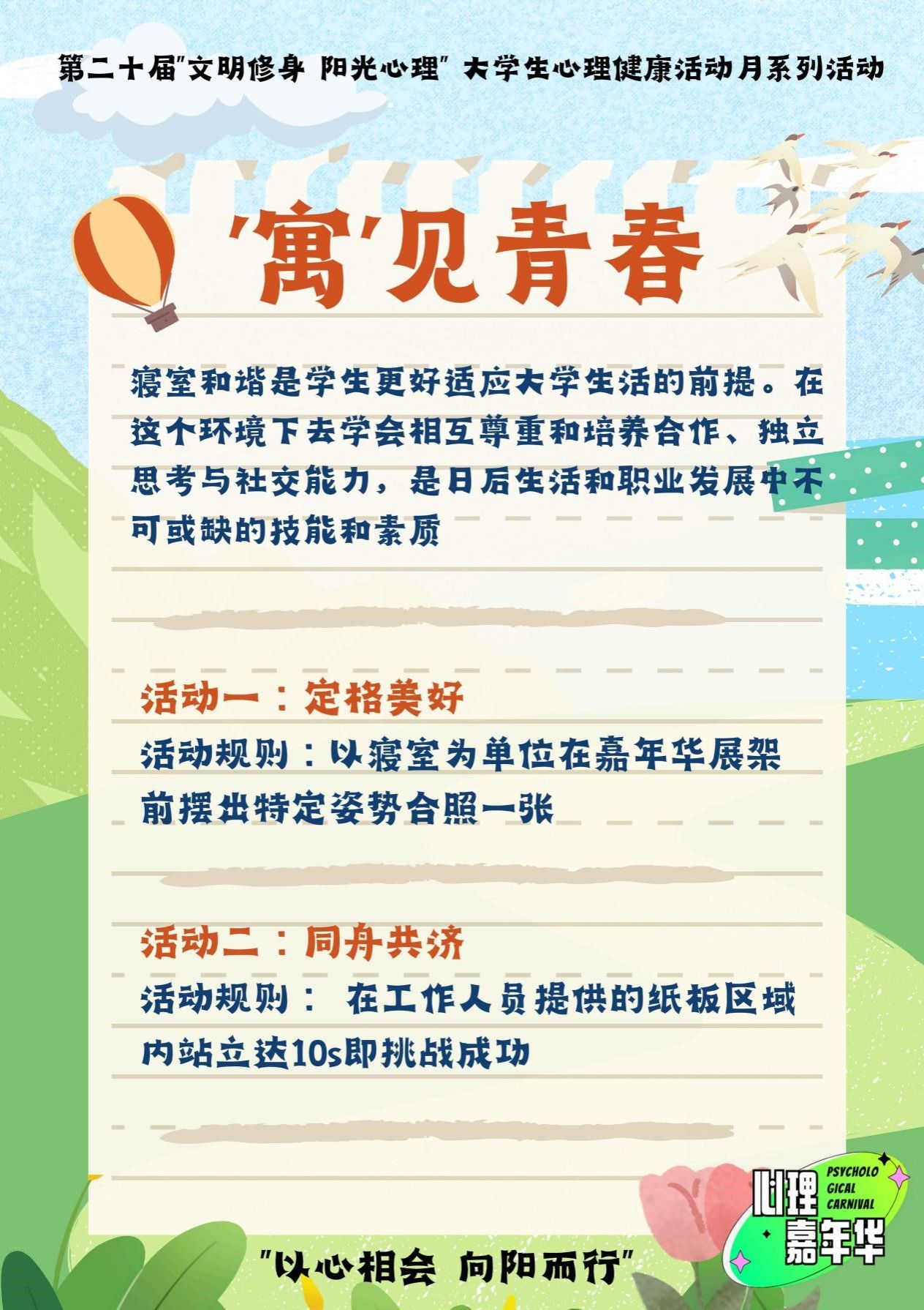 本次活动分为[悦纳自我]、[拥抱情绪]、[和谐人际]、[“寓”见青春]四个主题活动区,具体规则详见下方活动海报。欢迎同学们积极参与此次活动。