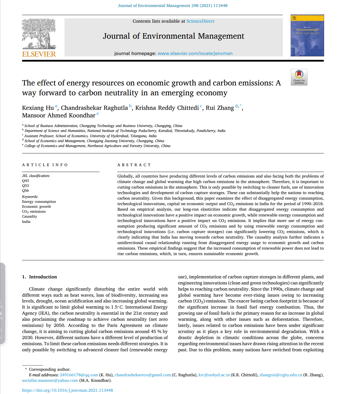 Hu K, Raghutla C, Chittedi K R, et al. The effect of energy resources on economic growth and carbon emissions: A way forward to carbon neutrality in an emerging economy[J]. Journal of Environmental Management, 2021, 298: 113448.