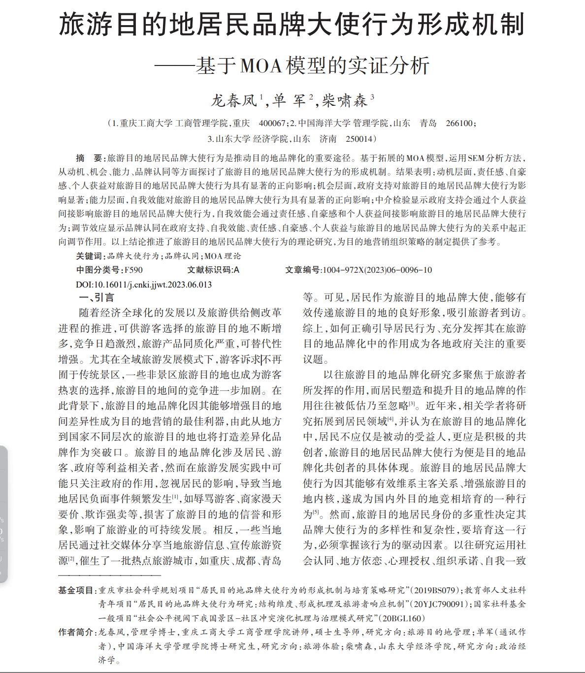 龙春凤,单军,柴啸森.旅游目的地居民品牌大使行为形成机—基于MOA模型的实证分析[J].经济问题, 2023(06): 96-105.