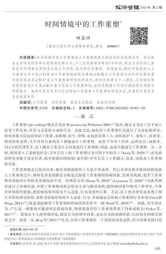 田喜洲.时间情境中的工作重塑[J].经济管理, 2024, 46(02):193-208.(AMI权威期刊)