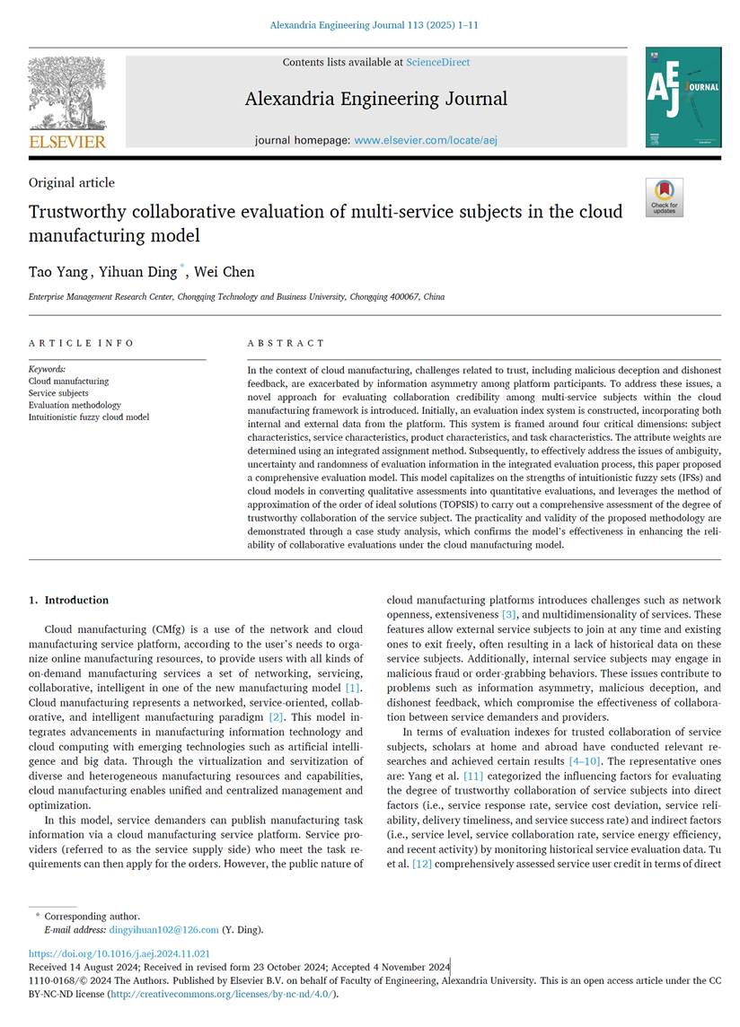 Yang T, Ding Y, Chen W. Trustworthy collaborative evaluation of multi-service subjects in the cloud manufacturing model[J]. Alexandria Engineering Journal, 2025, 113: 1-11.(中科院SCI二区Top期刊)