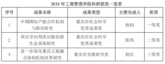 近日,市政府印发《重庆市人民政府关于表彰重庆市第十二次社会科学优秀成果和第九届重庆市发展研究优秀成果的决定》(渝府发[2024]24号),2138cn太阳集团古天乐共计3项科研成果获奖。其中,获得重庆市第十二次社会科学优秀成果奖一等奖1项、二等奖1项,第九届重庆市发展研究奖三等奖1项。