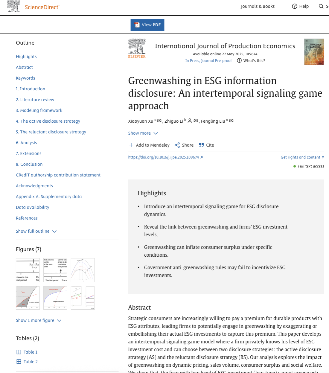 Xiaoyuan Xu(徐小媛), Zhiguo Li*(李志国), Fengling Liu, Greenwashing in ESG information disclosure: An intertemporal signaling game approach[J], International Journal of Production Economics, 2025, 109674, https://doi.org/10.1016/j.ijpe.2025.109674.(中科院SCI一区Top、ABS-3星期刊)