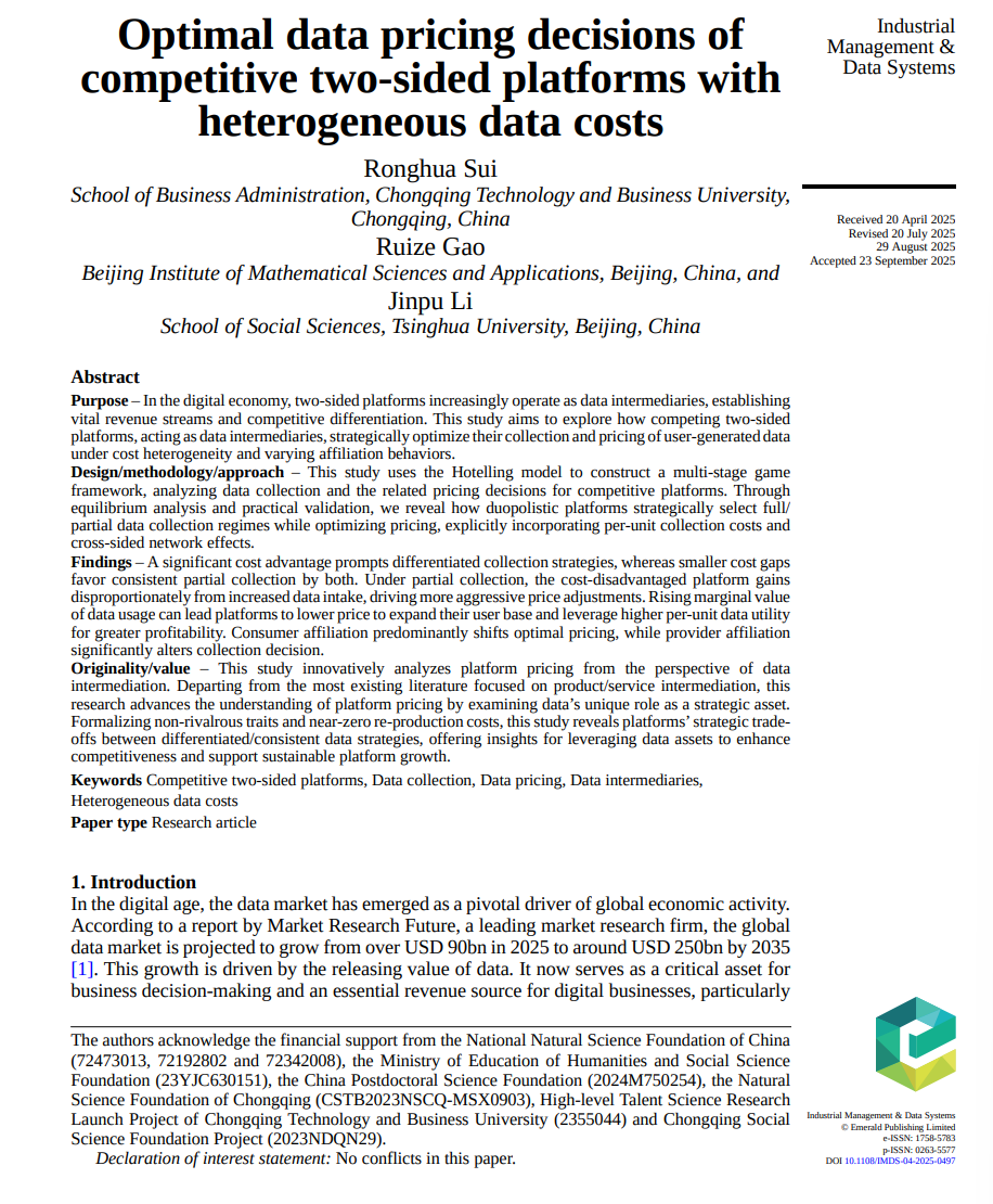 Sui R, Gao R, Li J. Optimal data pricing decisions of competitive two-sided platforms with heterogeneous data costs[J]. Industrial Management & Data Systems, 2025: 1-30.