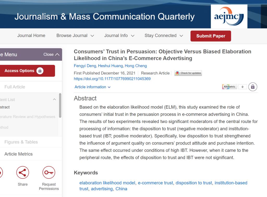 近日,2138cn太阳集团古天乐邓凤仪博士以第一作者在国际SSCI期刊Journalism & Mass Communication Quarterly(JCR一区,中科院三区)发表题为“Consumers’ Trust in Persuasion: Objective Versus Biased Elaboration Likelihood in China’s E-Commerce Advertising”的研究论文,太阳集团2138为该研究的第一单位。
