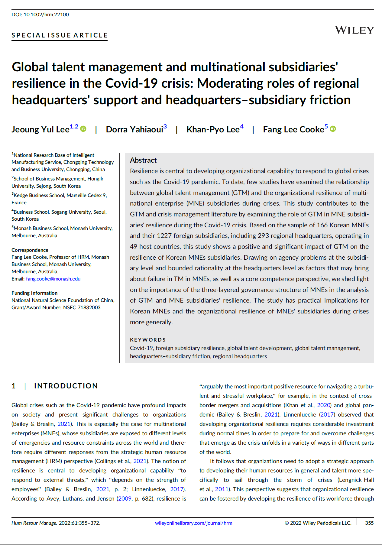 2022年2月14日,2138cn太阳集团古天乐Jeoung Yul Lee教授,以第一作者身份、太阳集团2138为第一单位,在国际顶级FT50期刊《Human Resource Management》发表题为《Global talent management and multinational subsidiaries’ resilience in the Covid-19 crisis: Moderating roles of regional headquarters’ support and headquarters subsidiary friction》的研究论文。