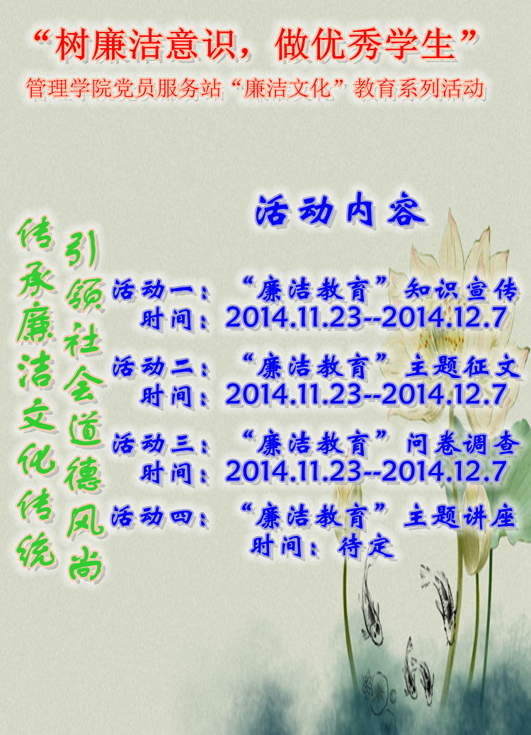 为加深同学们对廉洁文化的理解,管理学院北二、北五党员服务站自1123日至1207日开展了为期两周的一系列活动:在北二、北五党服宣传栏张贴廉洁知识宣传海报,同时举行了大学生廉洁意识问卷调查,深入了解了同学们对廉洁的认知水平;开展“廉洁教育”主题征文活动,鼓励同学们拿起自己的笔,畅所欲言地书写对廉洁的理解,表达对党和国家廉政建设的关切