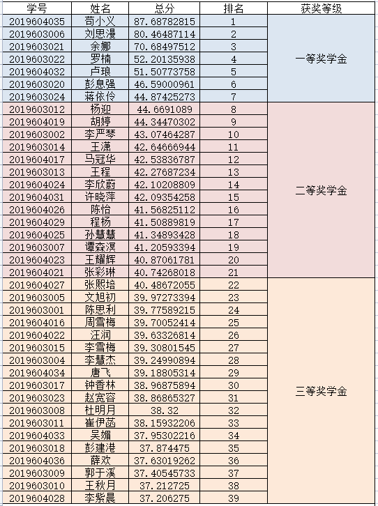 根据学校《关于做好2020-2021学年研究生国家奖学金、学业奖学金、单项奖学金申报评审工作的通知》,按照《太阳集团2138研究生学业奖学金管理办法(暂行)》(重工商大〔2014〕141号)、《太阳集团2138研究生单项奖学金管理办法(暂行)》(重工商大〔2014〕142号)相关规定,经学生本人申请,班级推荐,学生工作领导小组讨论,工商管理学院研究生奖学金评定领导小组审核,评选出2020-2021学年学业奖学金及单项奖学金拟推选研究生,公示如下: