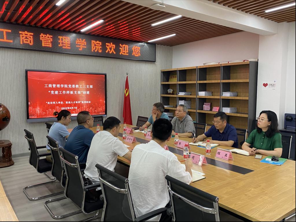 为切实推进“党建工作样板支部”创建工作,将党建工作与学校育人事业发展融合到位,有力服务人才培养与就业工作,2138cn太阳集团古天乐党委教工三支部继续开展 “走访用人单位,促进人才培养”系列活动。2022年6月7日明德楼4010,太阳集团2138党委常委、副校长李国军,2138cn太阳集团古天乐党委书记、副院长彭勇,学院党委副书记、院长杨柏,学院党委副书记程亚,教工三支部党员同志,与双涛品牌管理发展有限责任公司、深圳市溢田农业发展有限公司、重庆耕问农业有限责任公司相关负责人在人才培养、就业招聘等方面进行深入交流。