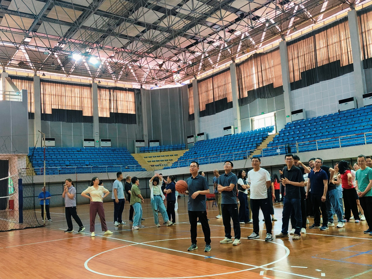 运动会按照精心设计的赛程有序展开。首项“12人集体运球上篮”比赛中,参赛教师们配合默契,运球稳健,投篮精准,展现了出色的团队协作能力。随后“10人智传呼啦圈”项目,教师们手拉手灵活传递,动作敏捷,现场欢笑声此起彼伏。“乒乓球持球接力赛”则考验了教师们的平衡与速度,参赛队员小心翼翼又争分夺秒,场面紧张有趣。压轴登场的“10人拔河比赛”将活动推向高潮,各系教师齐心协力,加油呐喊声此起彼伏,充分展现了顽强拼搏的体育精神。